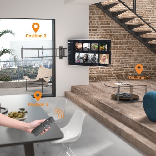 Finn den perfekte synsvinkelen med ett enkelt trykk. NORAUDIO PLB-M06 motoriserte svingbare TV-feste er designet for de fleste 32-75-tommers TV-er opptil 50 kg.